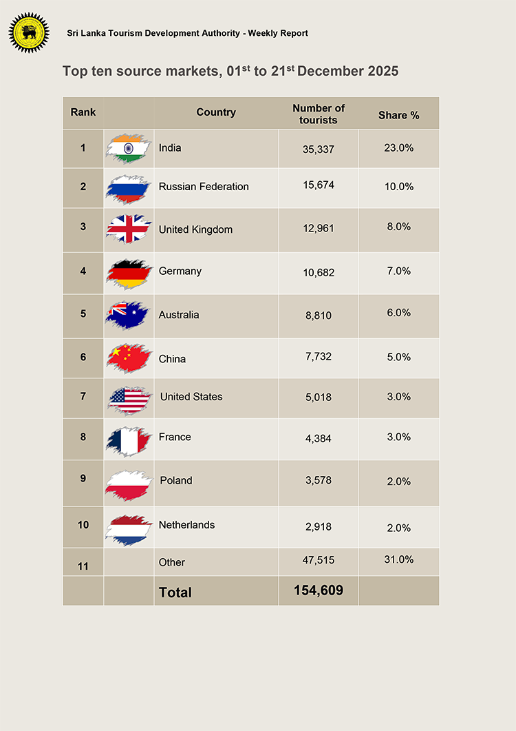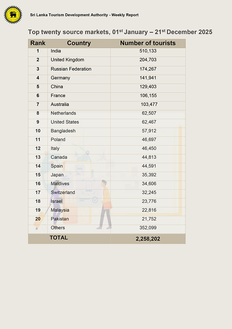 ඒ සමඟ දෙසැම්බර් මාසයේ පළමු දින 21 තුළ 154,609ක සංචාරකයින් පිරිසක් මෙරටට පැමිණ ඇති අතර වසරේ මේ දක්වා 2,258,202ක සංචාරකයින් පිරිසක් මෙරටට පැමිණ ඇත.