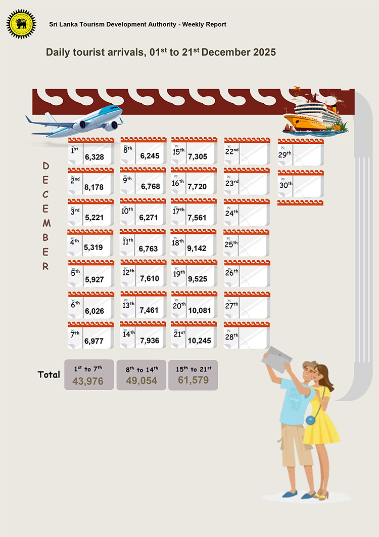 ශ්රී ලංකා සංචාරක සංවර්ධන අධිකාරිය සිය නවතම දත්ත වාර්තාවන් නිකුත් කරමින් පෙන්වා දෙන්නේ දෙසැම්බර් තෙවන සතිය තුළ 61,579ක සංචාරකයින් පිරිසක් මෙරටට පැමිණ ඇති බවයි.